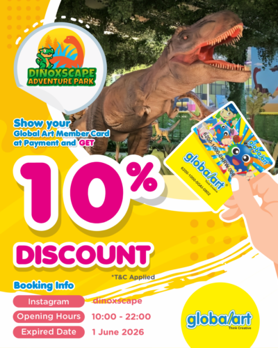 Dengan menunjukkan kartu member Global Art saat pembayaran, dapatkan diskon 10% untuk biaya masuk di Dinoxscape.